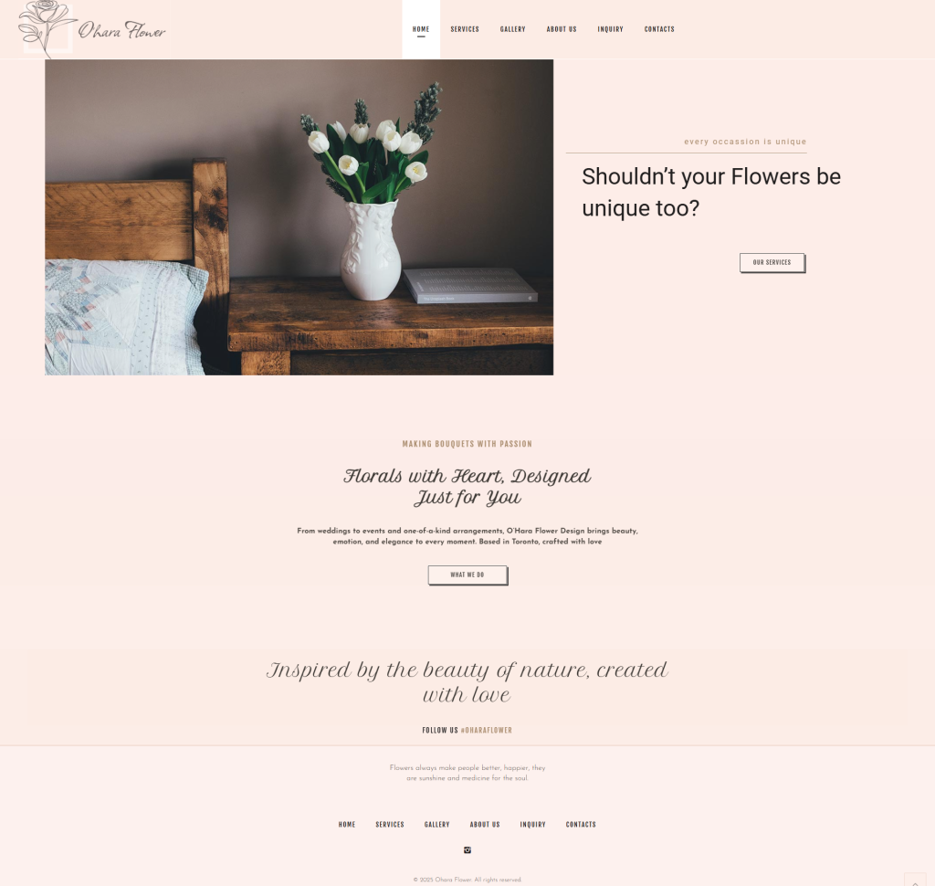 پروژه وب‌سایت O’Hara Flower Design با هدف انتقال حس «زیبایی، احساس و اصالت» در تمام جلسات و مناسبت‌ها طراحی شد. طراحی سایت با تاکید بر تصاویر بزرگ و بی‌ابهام، کاربر را مستقیماً به تجربه‌ی بصری سبک برند سوق می‌دهد.