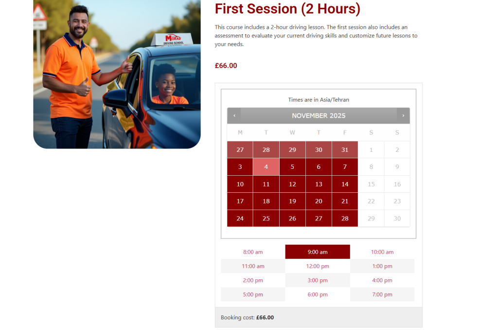کاربران میتوانند مستقیماً از طریق سایت، روز دلخواه خود را برای شرکت در کلاسهای رانندگی انتخاب کنند.انتخاب زمان بر اساس ساعت کاری مربی: