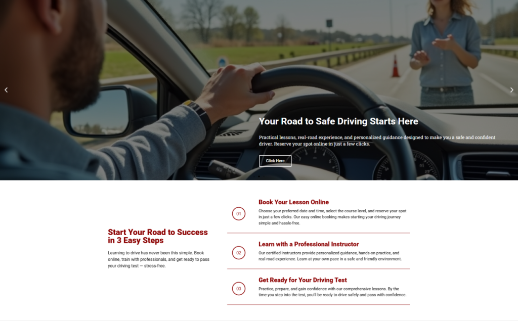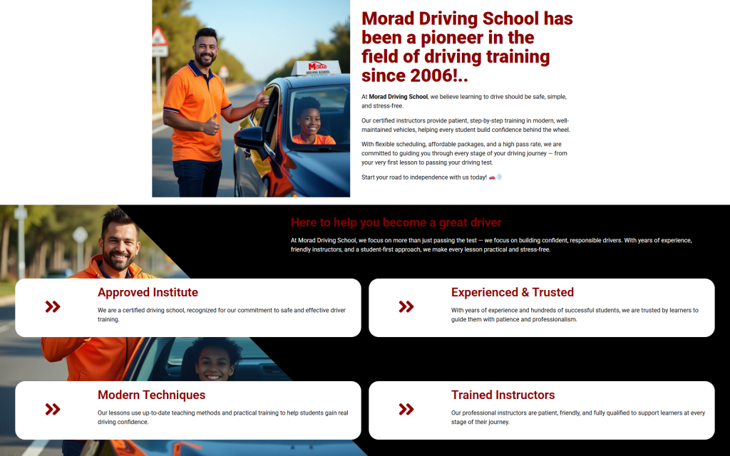 هدف از طراحی این وبسایت، ایجاد بستری کاربرپسند و ساده برای معرفی آموزشگاه رانندگی Morad Driving و فراهم کردن امکان رزرو آنلاین کلاسهای آموزشی بود. تمرکز اصلی بر روی تجربه کاربری آسان، وضوح خدمات، و دسترسی سریع به فرآیند رزرو قرار داشت